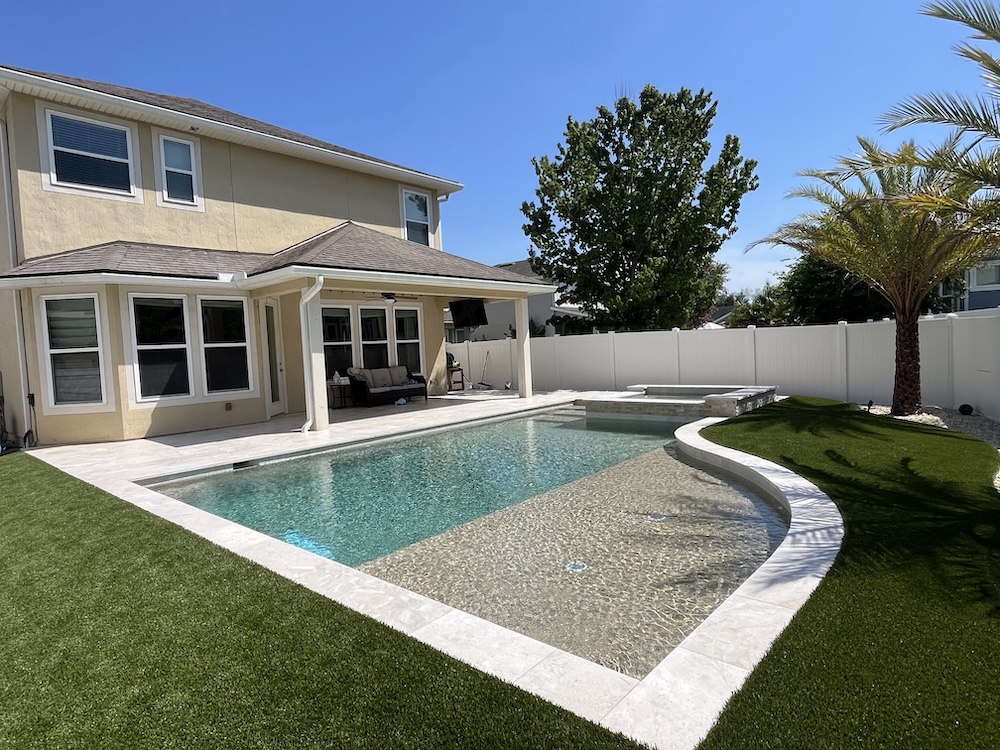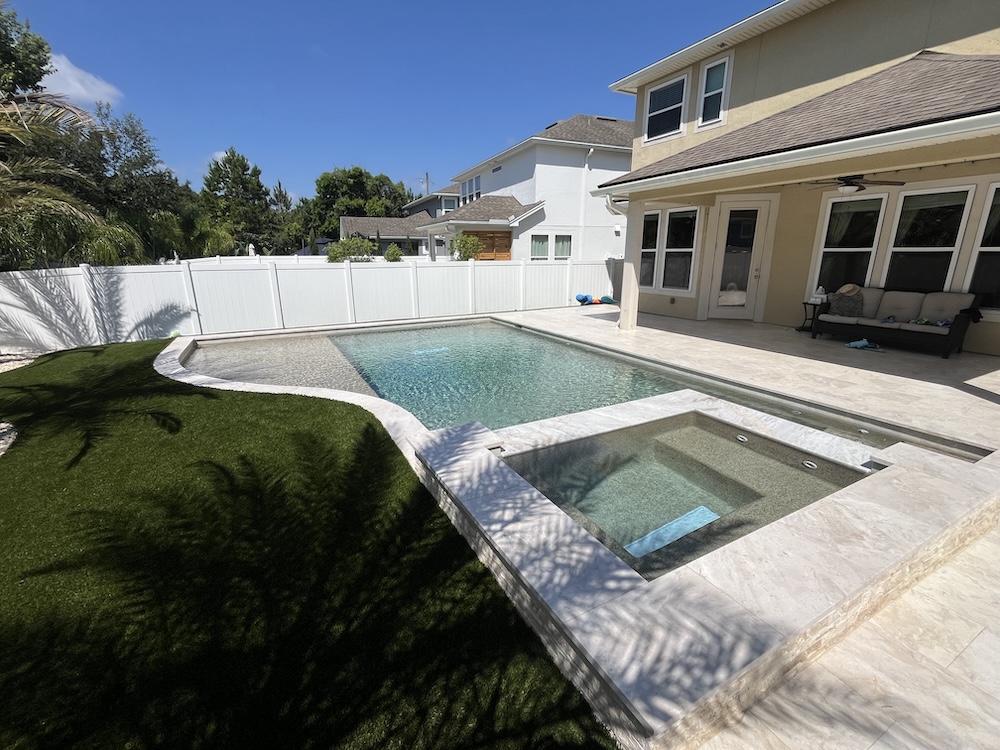 Vibrant iridescent ocean, deep blue, clear, and light blue glass beads, along with the sparkle of ocean shells, are combined with gold pebbles. The watercolor, in most cases, falls into a light aquamarine hue. The watercolor is reminiscent of the turquoise waters in the Caribbean. View our disclaimer page to set proper expectations. Visit our blog page to learn more about pool finishes.